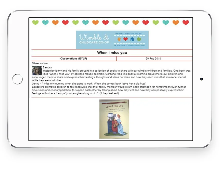 This is a program where educators document all your child’s learning and progress. You will get an invitation to join Story Park so you can see all your child’s learning and moments throughout the day. An invitation will be sent to you to download the app. You can access Story Park using a mobile device or computer.